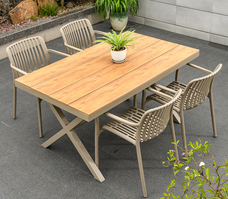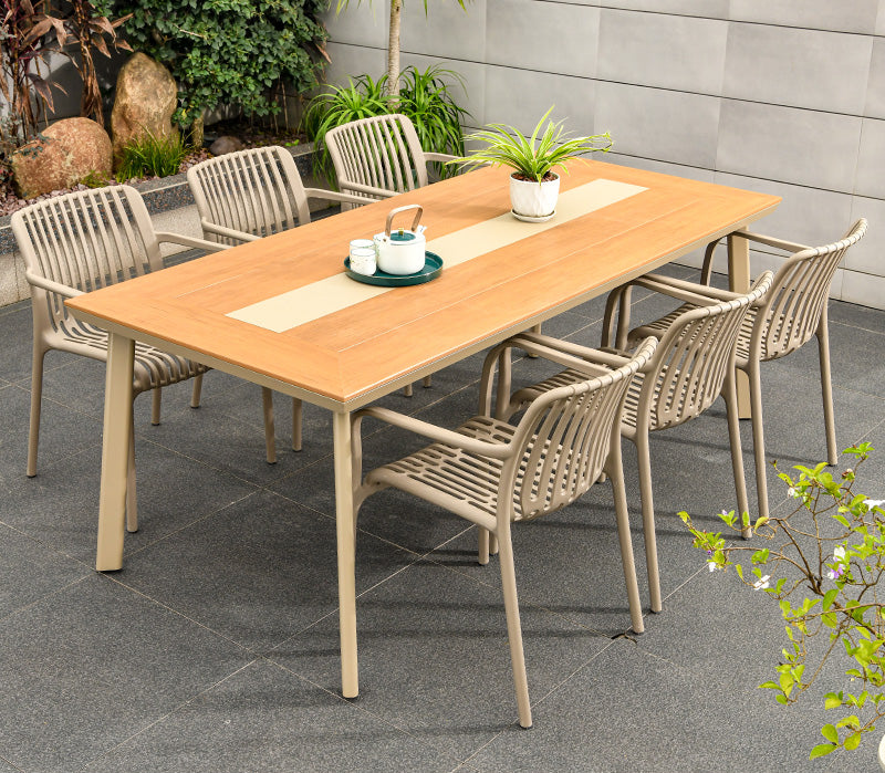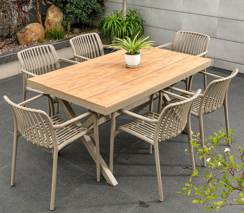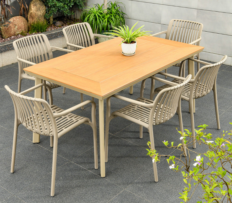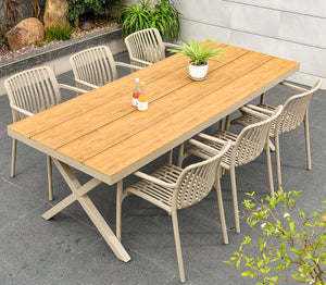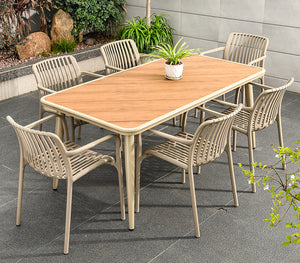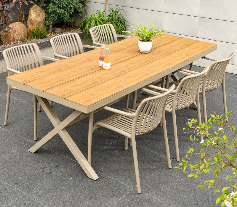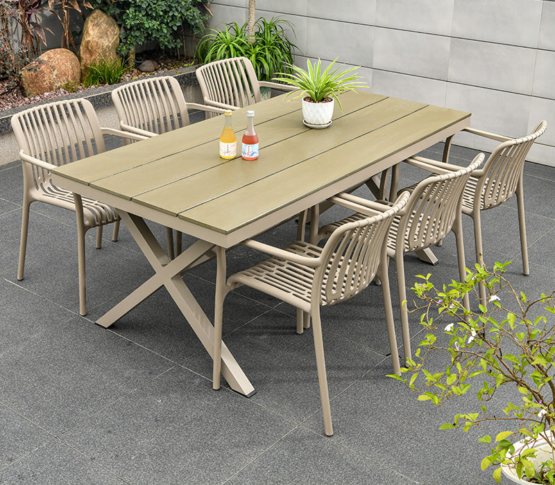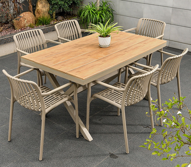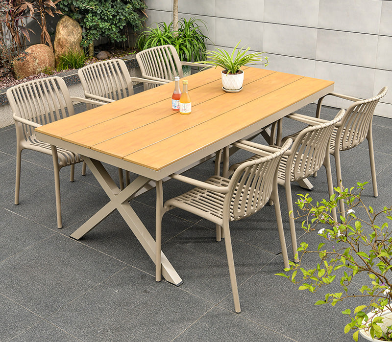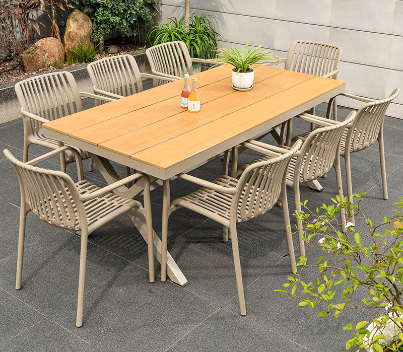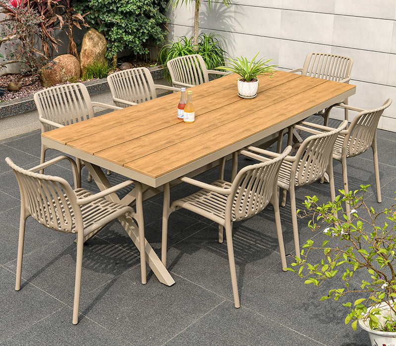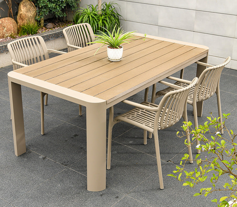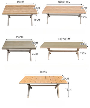 Upgrade your outdoor space with this durable and modern dining set. The table is crafted with a high-quality wood-plastic composite (WPC) top, offering the look of natural wood combined with the weather resistance and longevity of plastic. Supported by a sturdy aluminum alloy frame, the set is built to last. The chairs are made from water-resistant PVC, ensuring low maintenance and durability. Perfect for patios or gardens, this set is both stylish and functional, available in multiple configurations to suit your space.