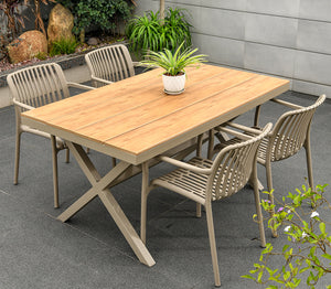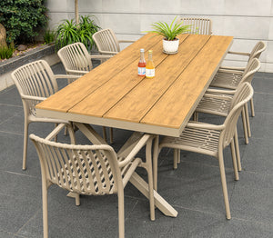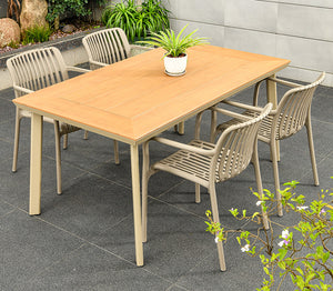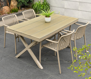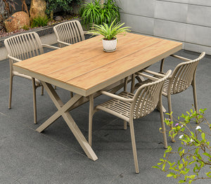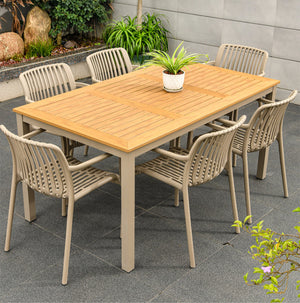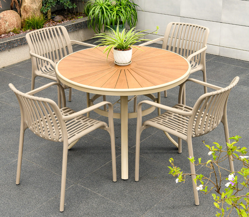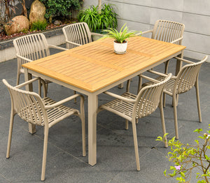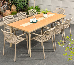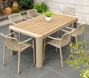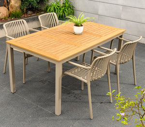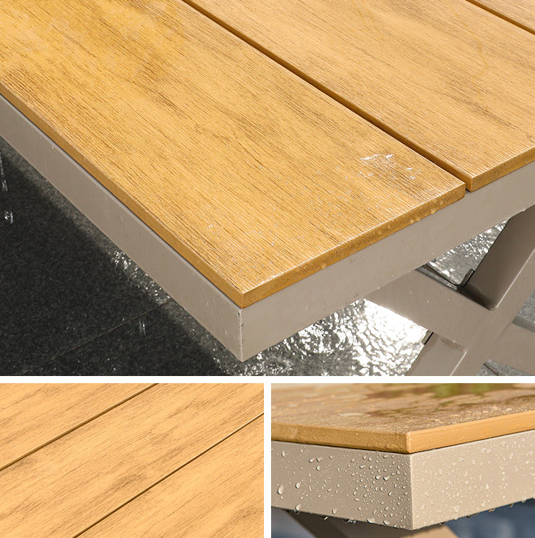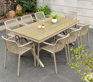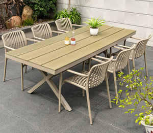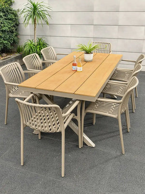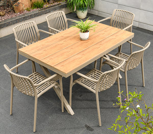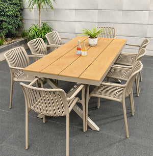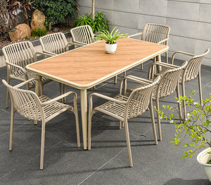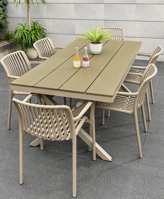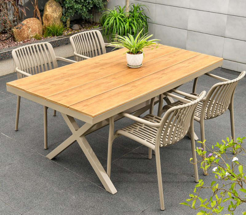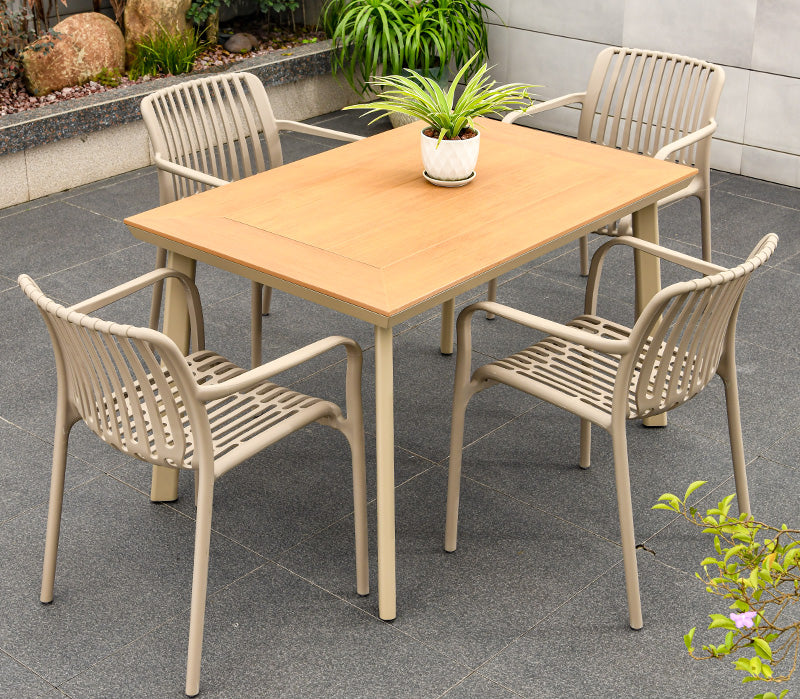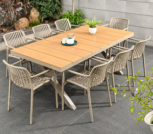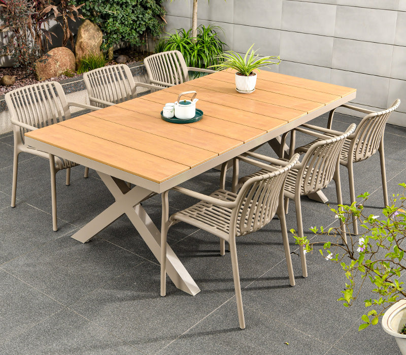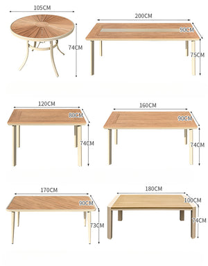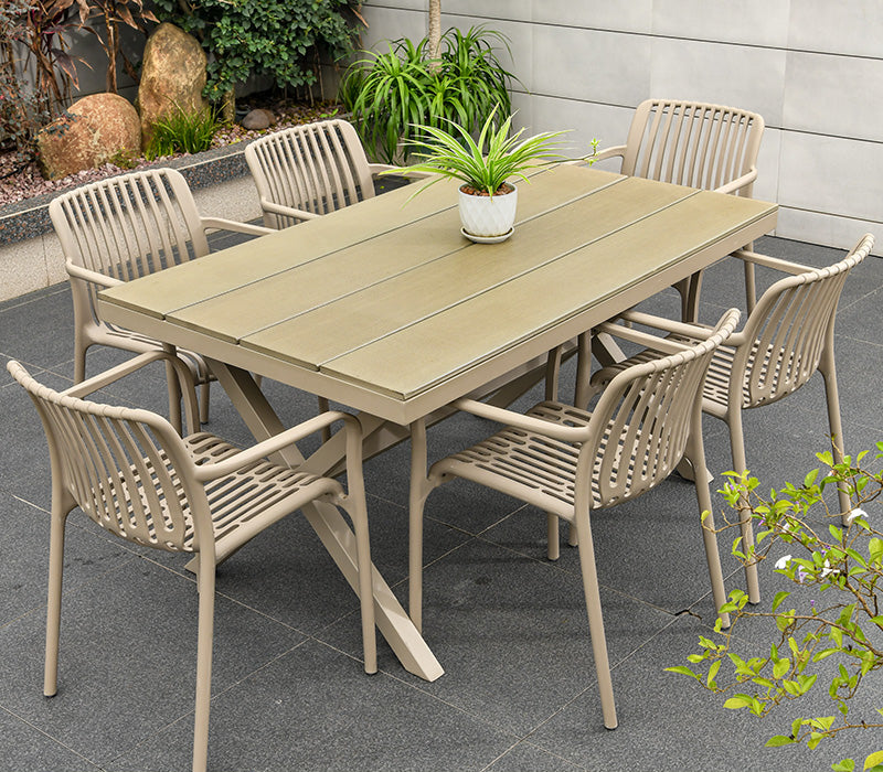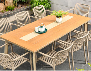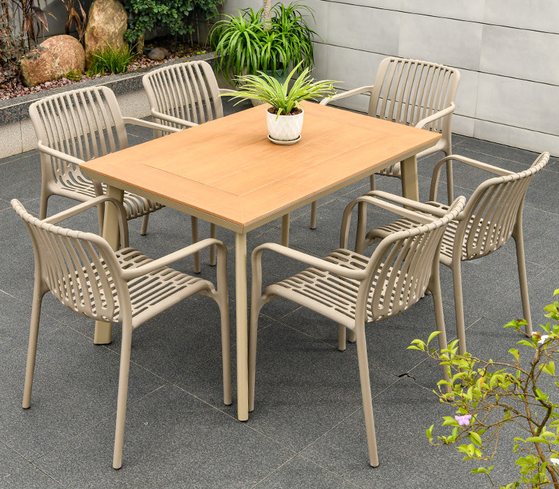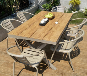 Upgrade your outdoor space with this durable and modern dining set. The table is crafted with a high-quality wood-plastic composite (WPC) top, offering the look of natural wood combined with the weather resistance and longevity of plastic. Supported by a sturdy aluminum alloy frame, the set is built to last. The chairs are made from water-resistant PVC, ensuring low maintenance and durability. Perfect for patios or gardens, this set is both stylish and functional, available in multiple configurations to suit your space.