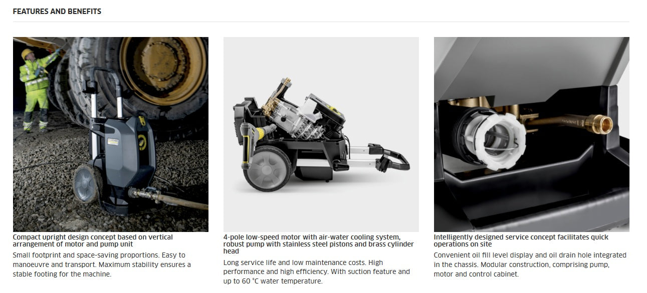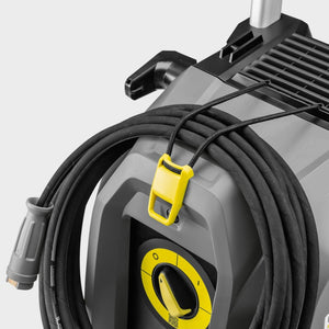 The HD 10/25-4 S cold water high-pressure cleaner takes ergonomic working to the next level. The practically designed EASY!Force Advanced trigger gun makes it effortless to use without any holding force. A rotating 1050-millimetre stainless steel lance delivers maximum efficiency. The Servo Control enables the user to control the pressure and water volume straight from the trigger gun/lance. Assistance systems and an LED status display also enhance the user-friendly design. You can count on Kärcher to use the best materials to guarantee the highest, longest-lasting quality. Working away inside the machine is a hard-wearing wobble pump with stainless steel pistons and a brass cylinder head. The HD 10/25-4 S is driven by a 4-pole low-speed motor with air-water cooling system. Integrated aluminium frame carriers reduce the weight and provide a lightweight yet hard-wearing chassis, making crane loading an option. The upright structure, whereby the motor and pump unit is installed in a vertical arrangement, offers maximum portability in practice. The compact design also incorporates clever accessory storage such as a stowage compartment and adjustable hooks.