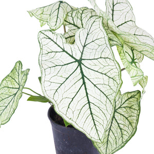 Caladium Allure Illuminate your indoor space with sophisticated tropical elegance using Caladium Allure – a premium fancy-leaved variety celebrated for its large, heart-shaped leaves in pure off-white with dramatic deep green veins and thin margins.