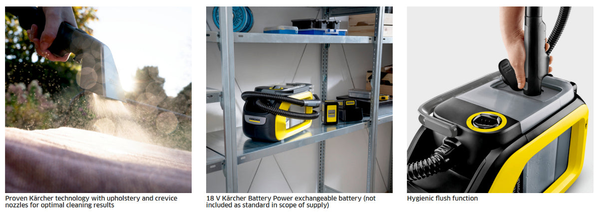 - Proven Kärcher technology with upholstery and crevice nozzles for optimal cleaning results