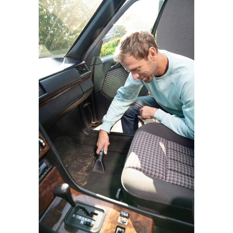 Fibre-deep cleaning with maximum freedom of movement: The SE 3-18 Compact spray extraction cleaner cleans textile surfaces thoroughly and residue-free. Thanks to the compact design, the device is not only handy but can also be used when there's no power outlet nearby, due to the 18 V Kärcher Battery Power battery (not included in the scope of supply). This allows the vehicle interior to be cleaned in just 12 to 24 minutes. You thus remove dirt from car seats, floor mats and the boot as well as garden furniture and upholstery in an instant – just as powerfully as with our corded spray extraction cleaners. The long and flexible suction hose with an inside cleaning agent hose also guarantees great convenience and flexibility, even in difficult-to-access places. Even after cleaning, the spray extraction cleaner will impress you with its hygienic flush function, which removes dirt from the device and hose, and thus prevents bacteria and odour formation. Totally in line with the motto of 'clean vehicle, clean cleaning device'.