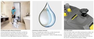 • Disinfection without chemicals — Resource-friendly and residue-free, as only cleaned with water. Maximum safety as the development of multiresistant germs is prevented.  Surface-friendly cleaning without chemicals.