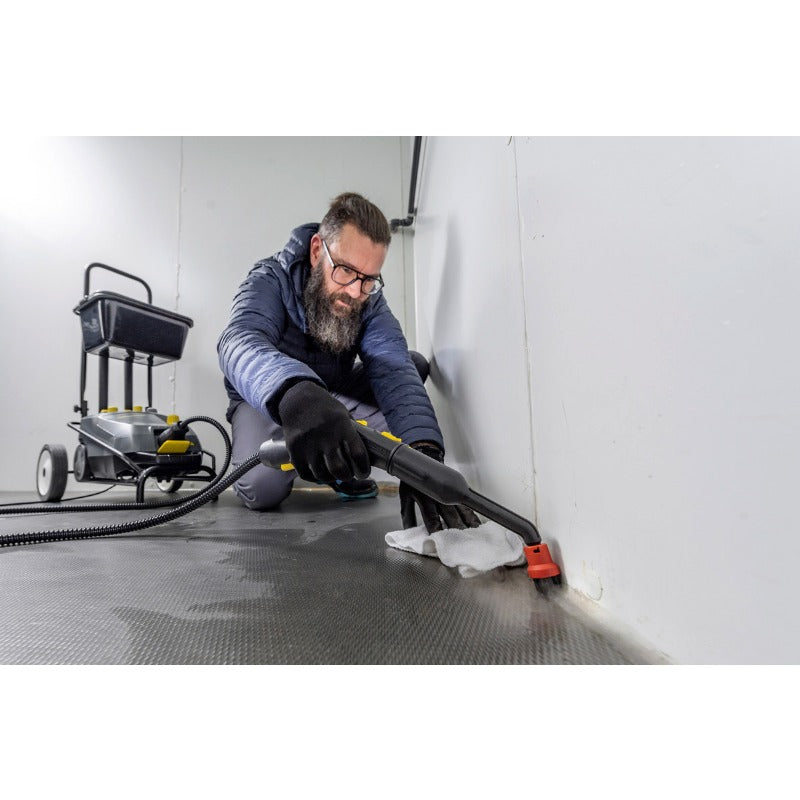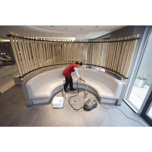 The SG 4/4 is a compact and robust steam cleaner, which thanks to 4 bar steam pressure impresses with excellent cleaning performance and certified disinfection*. The infinitely variable steam quantity control and the VapoHydro function for the infinitely variable control of the steam saturation allow a perfect adaptation of the machine to the respective cleaning task. The two-tank system which heats up quickly can be filled continuously, thus allowing long periods of uninterrupted work. The machine has an integrated temperature indicator, works entirely without chemical additives and is universal. The comprehensive equipment package includes 2 floor nozzles (for abrasive and hygienic cleaning), an integrated storage compartment for accessories, an integrated cable hook, as well as a holder for tubes for space-saving storage. (* in accordance with EN 16615, PVC floor, machine: SG 4/4 (floor nozzle with lamella, 30 cm/s, max. steam pressure, min. VapoHydro), test bacterium: Enterococcus hirae ATCC 10541, test virus: MVA, Murines Norovirus, Adenovirus.)