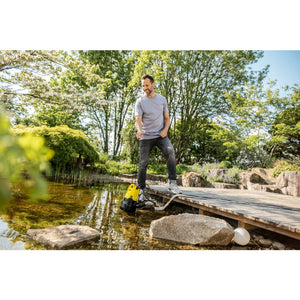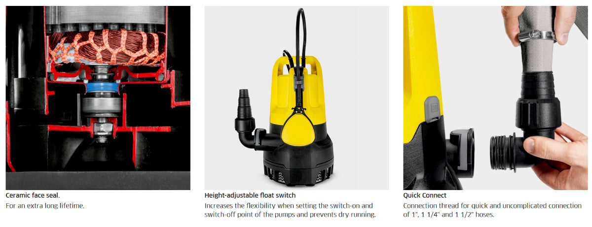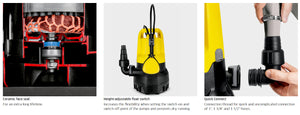 The SP 22,000 Dirt is the most powerful submersible dirty water pump from Kärcher. With up to 22,000 l/h, it is perfect for particularly challenging drainage tasks such as in large garden ponds, flooded basements or construction pits. The pumps can handle dirt particles of up to 30 mm. If larger dirt particles threaten to cause a blockage, the integrated stainless steel prefilter can be pulled down to protect the pump impeller. The slide ring sealing also used in the Professional range ensures an extra-long lifetime. There is even the option to extend the warranty to five years. The float switch enables other practical functions: It automatically switches the pump on and off depending on the water level, prevents dry running and its height can be adjusted. It can also be secured so that the submersible pump pumps out down to a depth of 35 mm during continuous operation. The Quick Connect connection thread also enables the quick and simple connection of 1", 1 1/4" and 1 1/2" hoses.