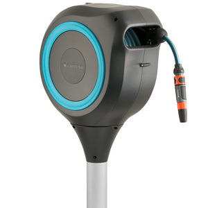 The Garden Hose Box RollUp M from GARDENA not only ensures safe and space-saving storage of your garden hose, but you will be thrilled how effortless watering your medium-sized garden can be. The practical Garden Hose Box is anchored in the ground using sturdy stand at a location of your choice in a flowerbed or on the lawn. With the help of a mounting rod you can screw the metal spike into the ground even easier. For use, simply pull out the 20-metre-long water hose to the desired length and you can start watering immediately. Thanks to the built-in short locking points, handling the garden hose has never been so simple: as soon as you stop with the hose, the locking device automatically engages at the desired extension length. The innovative design can be swivelled through 360°, ensuring maximum flexibility for garden irrigation. The box always follows your movements, so you can easily reach every corner of your garden without the garden hose kinking or tangling. In addition, this hose box saves you from tiresome cranking, rolling up and dirty hands: A short pull on the end of the hose releases the lock and an integrated steel spring rolls the garden hose back in fully automatically and reliably. The box has a practical hose guide that keeps the hose on track so that no blockages or knots occur. The innovative RollControl technology ensures safe, controlled and effortless retraction with zero tangles. The high quality material is protected by both UV and frost protection and offers a long service life and usability without maintenance. The box is particularly compact and stylishly designed so that it can be easily integrated into any garden. In addition, it is adjusted to the height of the GARDENA Mowing Robots so that the lawn around the Hose Box is always maintained and mowed. Included with the Garden Hose Box is a flexible connecting hose, all necessary assembly parts and Original GARDENA System elements as well as a sprayer with two different spray patterns. GARDENA gives a five-year warranty on the Garden Hose Box RollUp M. Watering that’s always ready for action.