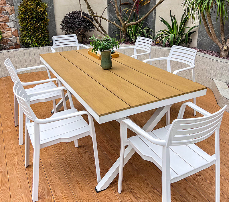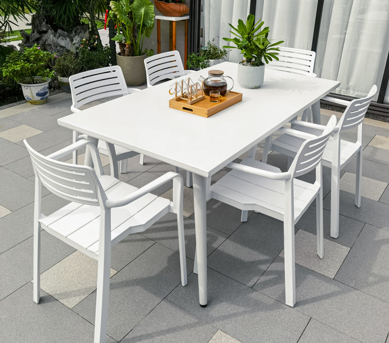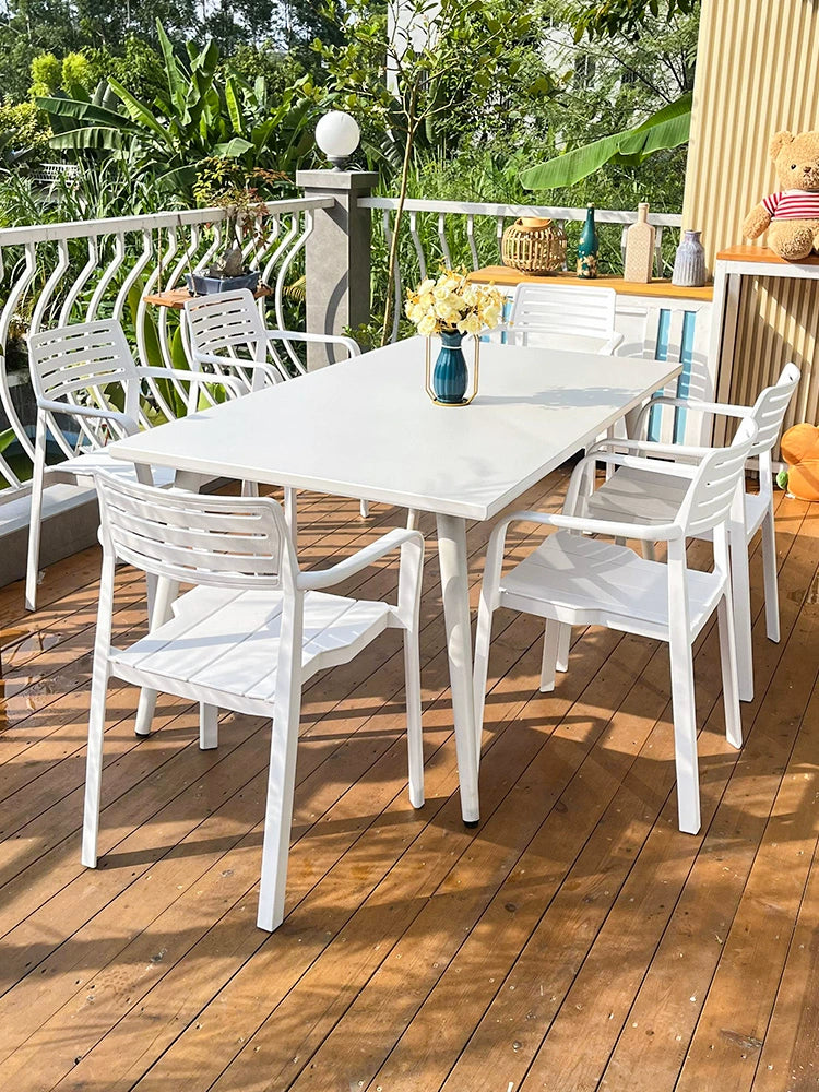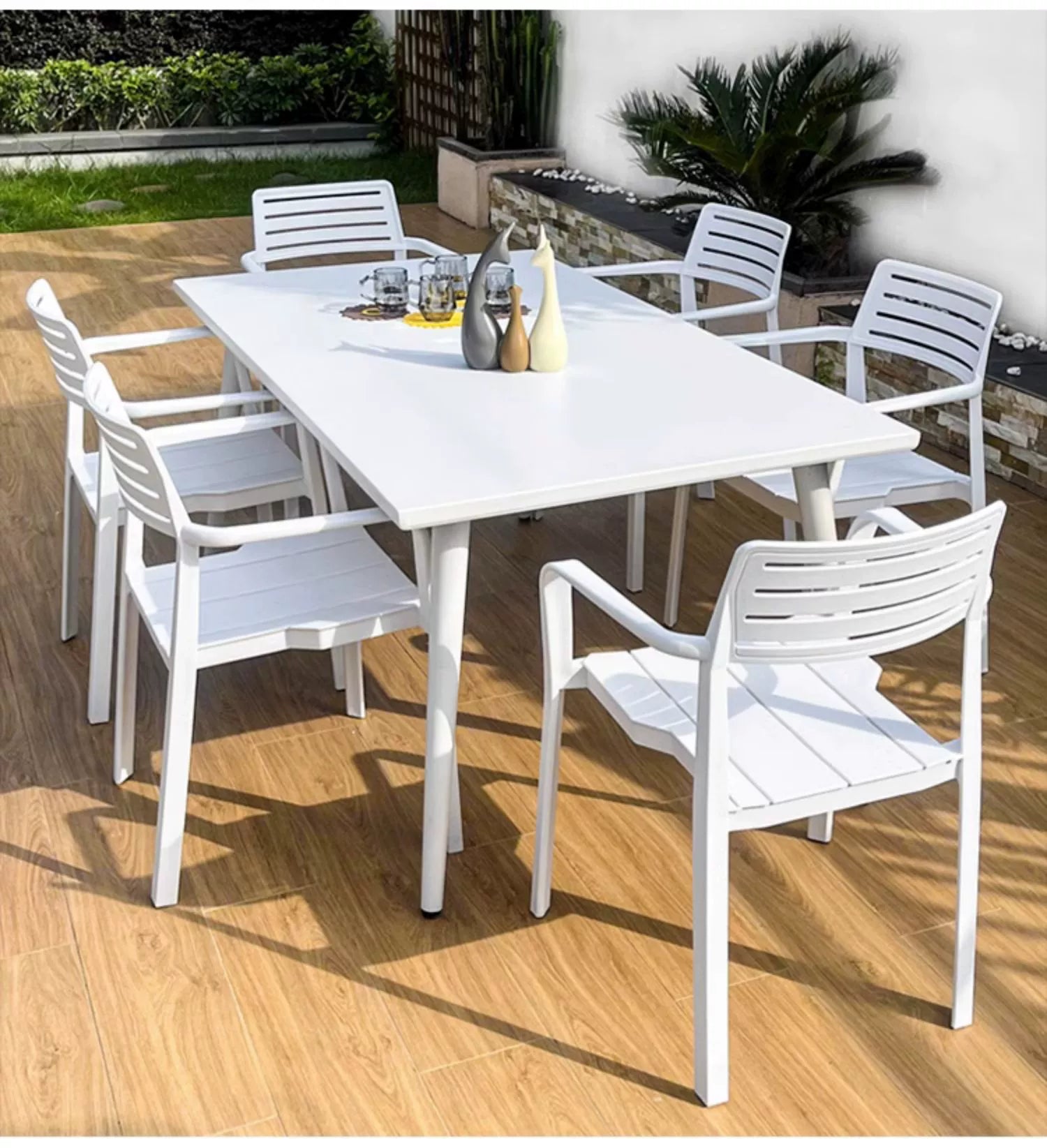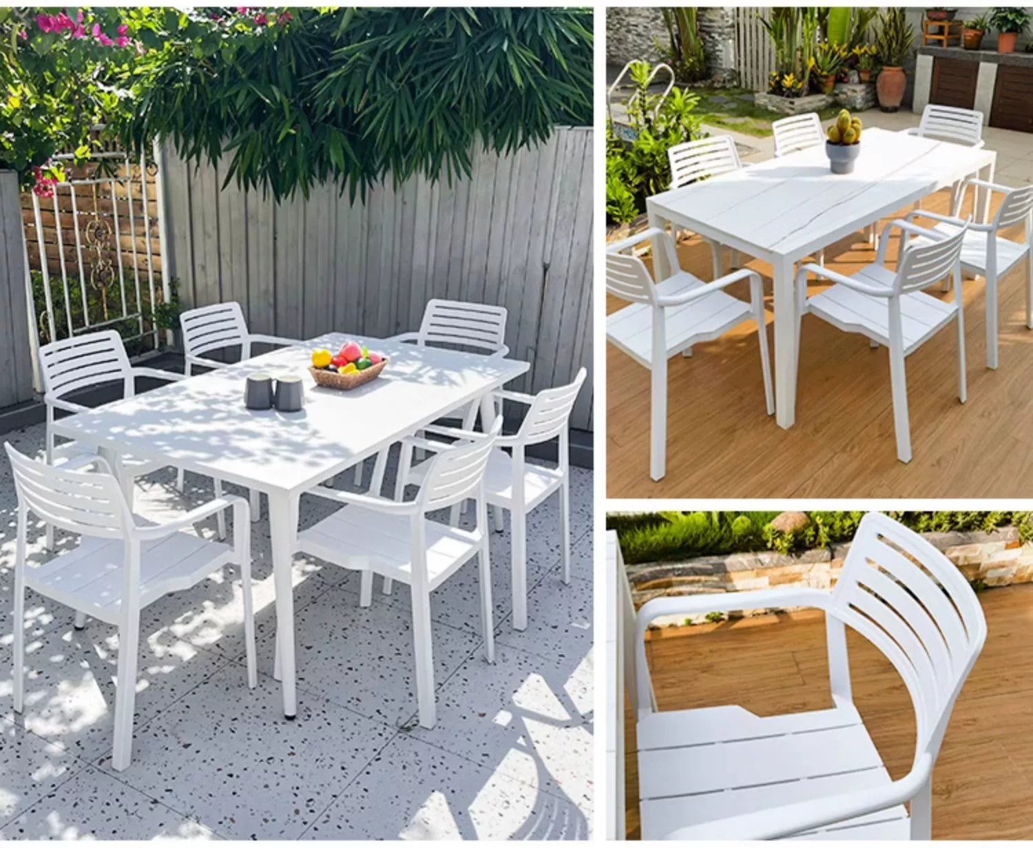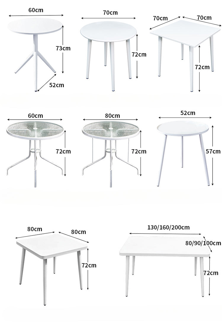This elegant outdoor dining table set is available in various material options to suit your style and durability needs. Choose from table surfaces made of wood-plastic composite (WPC) for a natural wood finish, carbon steel for added strength, glass for a modern look, or aluminum alloy for lightweight durability. Paired with matching chairs, this set is perfect for outdoor dining on patios, gardens, or terraces.