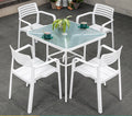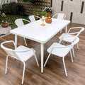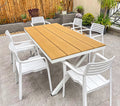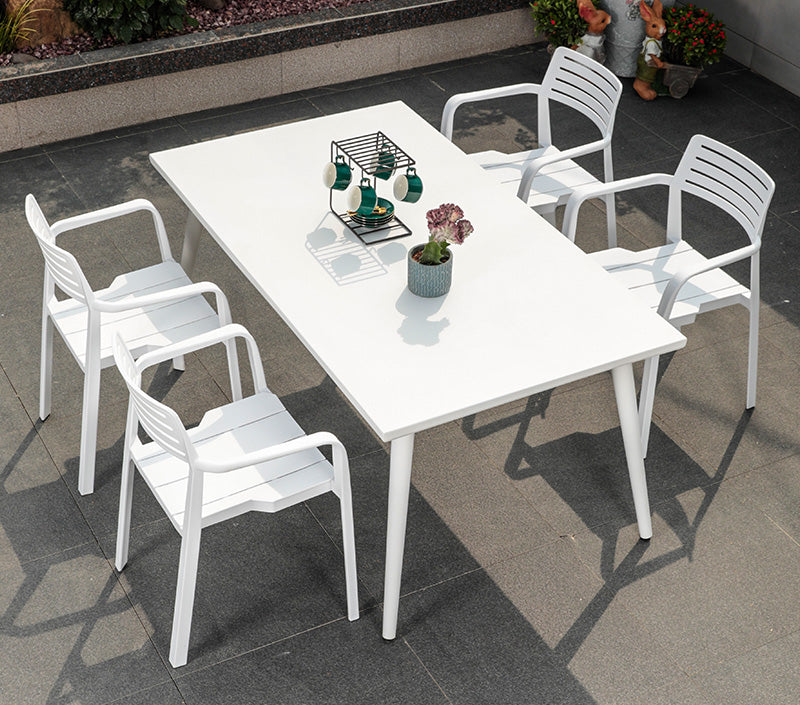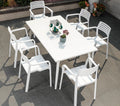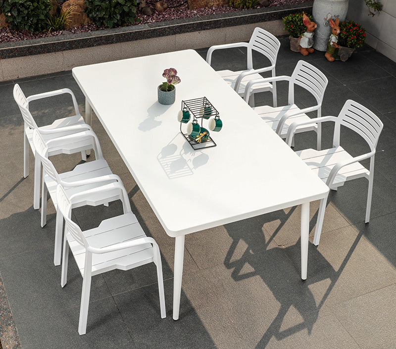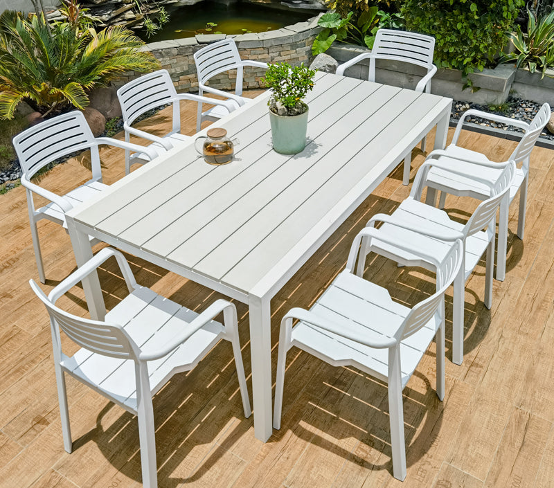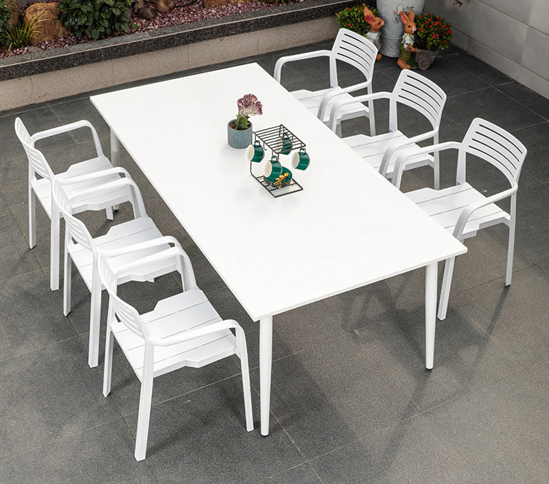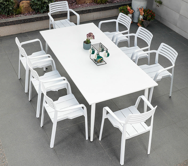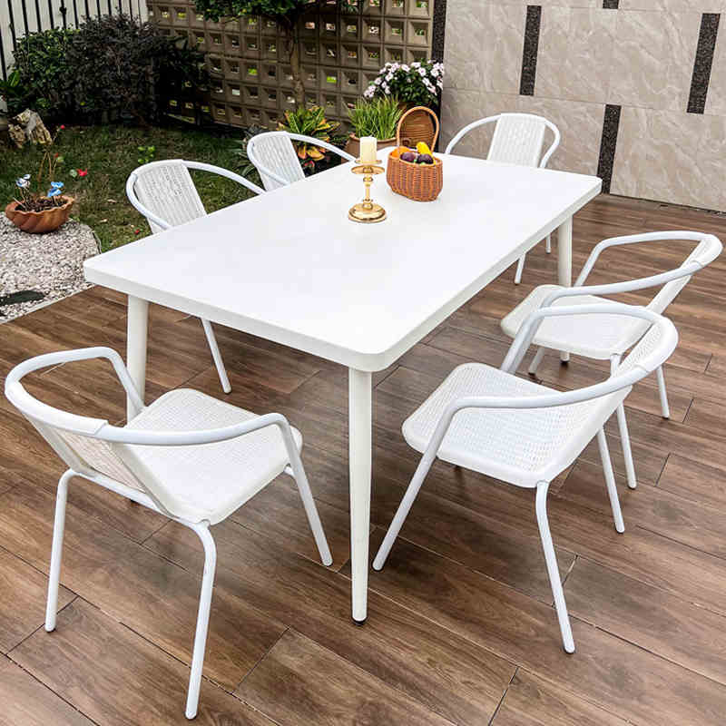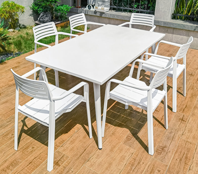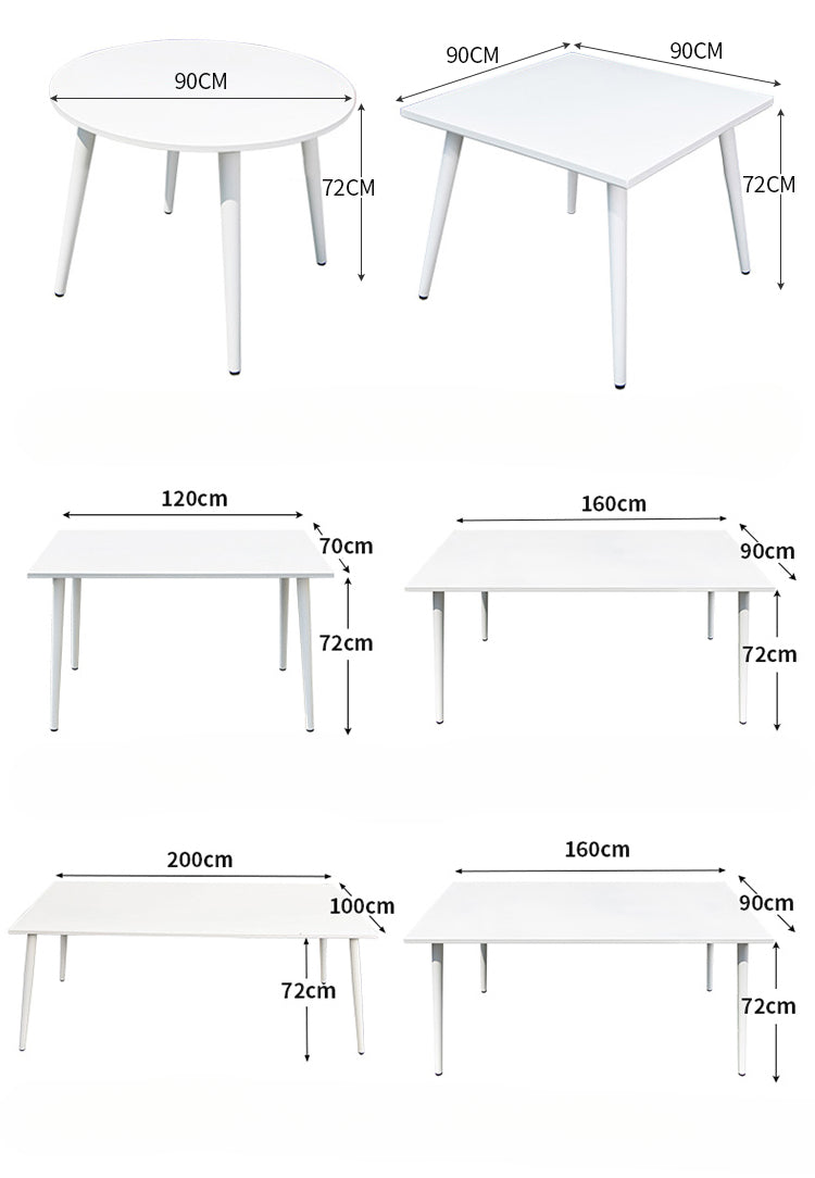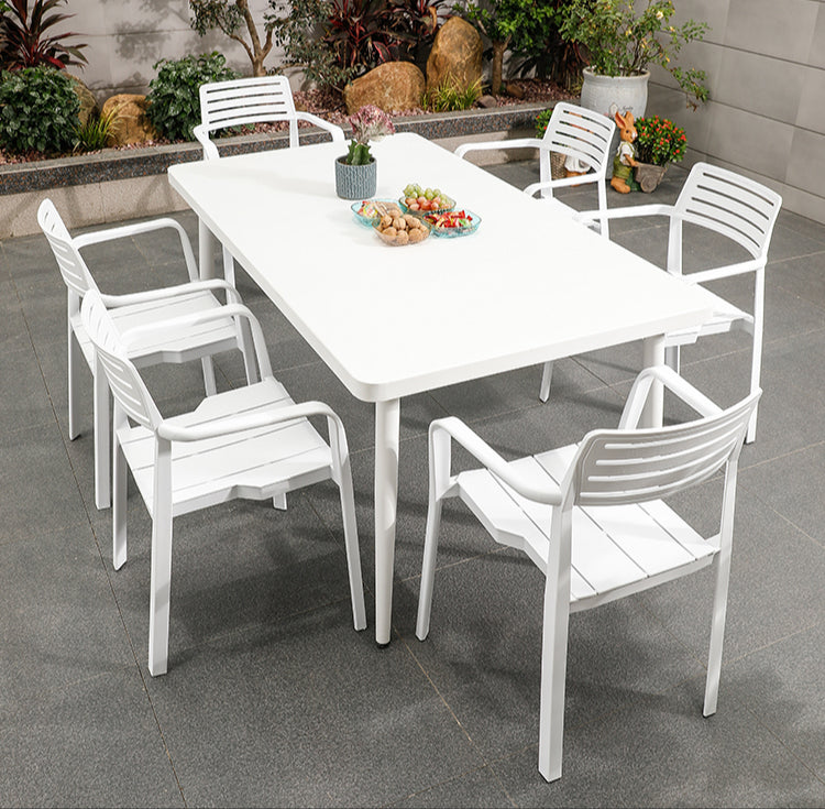 This elegant outdoor dining table set is available in various material options to suit your style and durability needs. Choose from table surfaces made of wood-plastic composite (WPC) for a natural wood finish, carbon steel for added strength, glass for a modern look, or aluminum alloy for lightweight durability. Paired with matching chairs, this set is perfect for outdoor dining on patios, gardens, or terraces.